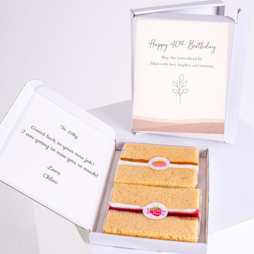 Deliver a mouth-watering piece of letterbox cake with your words printed directly onto the box. Freshly baked daily and delivered nationwide through standard letterboxes.
