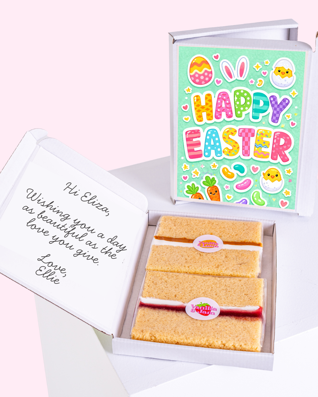 Treat someone to a sweet slice of joy featuring your message right on the box. Delivered with love, baked with joy – straight to their letterbox.