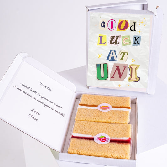 Wish them the best of luck at university with a thoughtful gift that’s as sweet as it is meaningful. Handmade in the UK, our freshly baked cake is delivered straight through the letterbox with your personal message included. With next day delivery, it’s the perfect way to show support and encouragement as they begin their new journey.