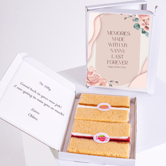 Gift a freshly baked slice of cake with your personalised message printed on the box. Sealed for freshness and sent with care to any UK address.