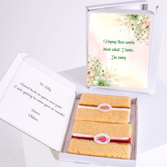 Brighten their day with a mouth-watering piece of letterbox cake featuring your message right on the box. Perfect for any occasion with fast UK-wide delivery.