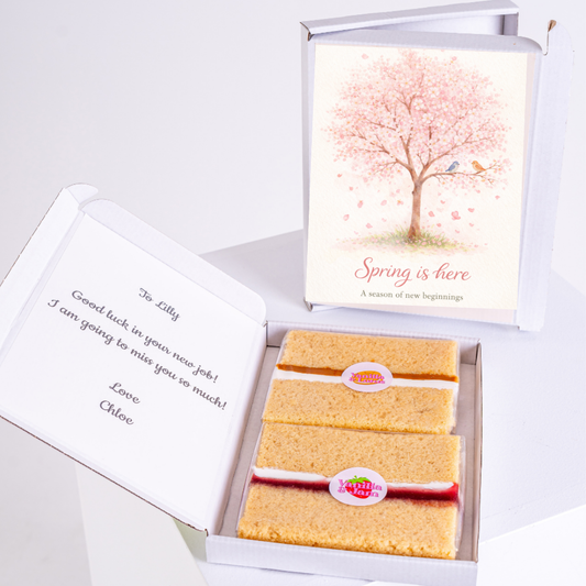 Treat someone to a sweet slice of joy featuring your message right on the box. Delivered with love, baked with joy – straight to their letterbox.